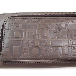 This is a Petrusco light brown leather ladies wallet. It features a zippered change compartment, zippered receipt/bills area, 12 cc slots plus a license window and two additional areas for what-have-you.