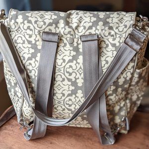 Adorable, gently used Petunia Pickle Bottom Box Backpack. Style: Breakfast in Berkshire. Grey print with light green embroidered embellishment. Good condition- some signs of wear on the bottom of the bag, but no issues on front and sides. Comes with diaper pad that zips into front section.