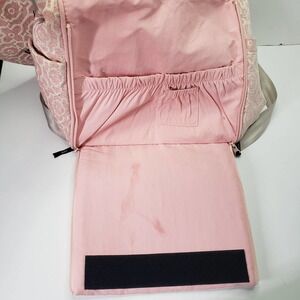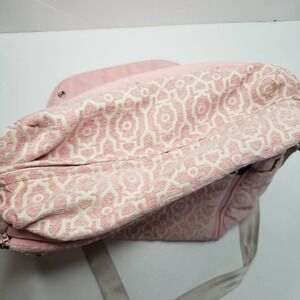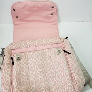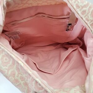 Key features: light pink/ivory textured fabric outer - sort of a velvety carpet bag feel, taupe straps, multiple zip pockets