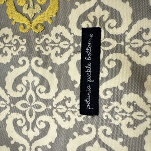 This is a Petunia Pickle Bottom unisex diaper bag in a large gray canvas with a floral pattern. It features numerous sections, inner and outer pockets, inner dividers, a detachable strap, and a clip for keys. The bag includes a changing pad, adjustable strap, and is foldable. It has a messenger style with a flap closure and the brand logo. Made in China.