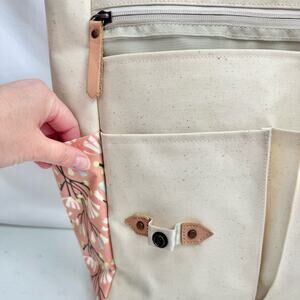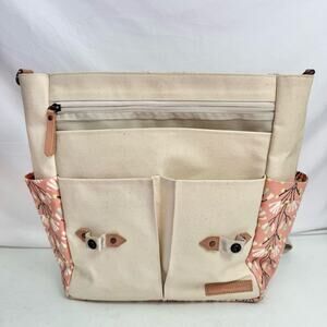 Good used condition! Coded canvas tan diaper bag backpack. Soft pink floral design accents. Lots of inner compartments, pockets and zippers. Small changing pad included. Soft fabric adjustable straps with bronze colored hardware. Hardware for cross body is intact however cross body strap is missing. large flap with two button snap closures. Minor imperfections on interior, as well as, one imperfection on front of bag. Would look great with a pin accent in the middle for spot coverage.