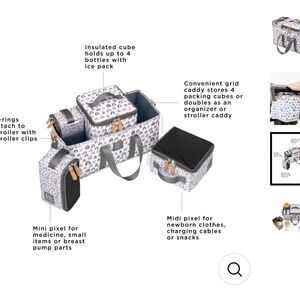 Organize... but make it cute! The Inter-Mix Deluxe Kit is a full set of lightweight packing cubes with a convenient carry caddy to keep everything organized in your diaper bag, stroller or nursery. Built-in straps attach to stroller handles for an on-the-go stroller organizer. Or, use this packing cube and caddy set to organize your art supplies, diaper changing table, and more. Compatible with all full-sized Petunia Pickle Bottom diaper bags. The Inter-Mix Deluxe Kit includes 2 Mini Pixels, 1 Midi Pixels, 1 Cool Pixel, and the Grid Caddy.