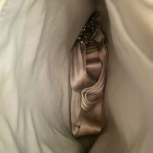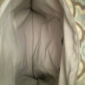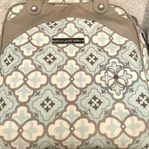 Light grey, blue, and white diaper bag. Has some staining on the bottom. But the rest is clean and well cared for. Comes with changing mat that is washable.