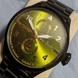 • Peugeot oversized 46mm watch - Bold numeral and luminous hands - Additional 2 sub-dial indicates the day of the week & the date.