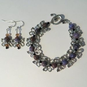 A string of pewter butterflies create a charming look for this bracelet and earring jewelry set. The agate beads from this set feature swirls of purple, chocolate brown, burgundy, and black. The set also features black swarovski crystals.