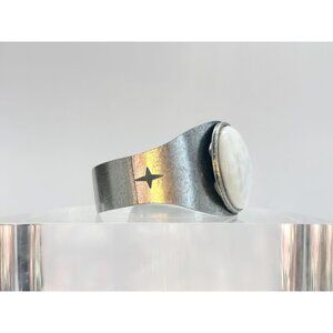 Pewter silver toned vintage cuff bracelet. The center XL stone is faux mother of pearl, bezel set. There are two cutouts along the side which look like the polaris star. Open stuff style so it's a little bendable to get adjusted to your size. Pewter is known to be hardy, long lasting and enduring against the natural elements.