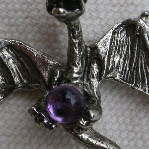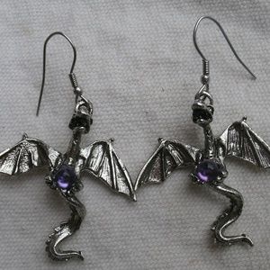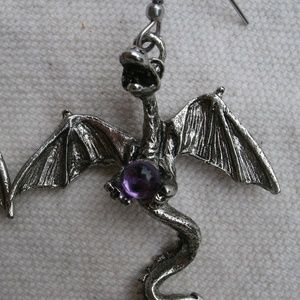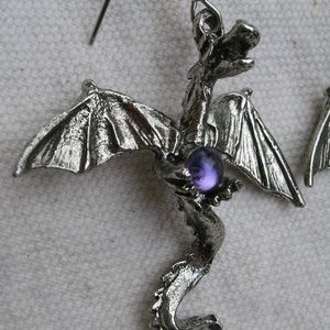 Flying dragon earrings with French style earwires. Made of pewter, each dragon holds a round purple set. Open wings. 3D: has full back side of dragon. Made in USA by Real Metal. Each dragon is 1 3/4 inches long and 1 1/2 inches wide. Total length with earwire is 2 1/4 inches. Lovely detail. Great for dragon fans and fantasy lovers.