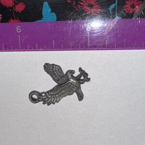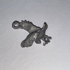 This is a Pewter eagle pendant. About the size of a nickel. Handmade. It looks like the eagle is landing.