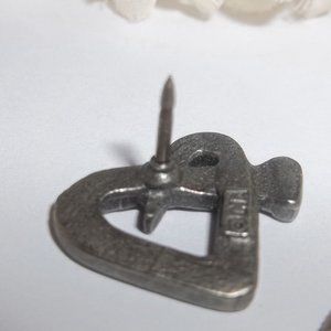 This little pre-owned costume jewelry pin is so unique. It has a primitive looking square head nail design shaped into a heart. Pewter in color. The back has a sharp push pin on the back. Marked with the copyright symbol and CTA. Adorable to use on a coat lapel or as a scarf pin to tack your scarf in place. Great wearable piece. Measures 5/8 inch tall and 3/4 inch wide. Buy it now before someone else does!
