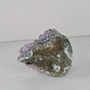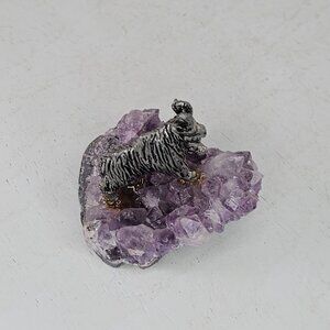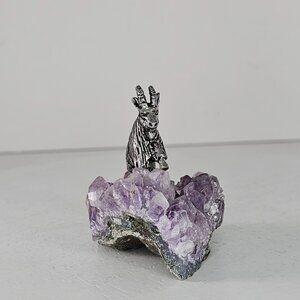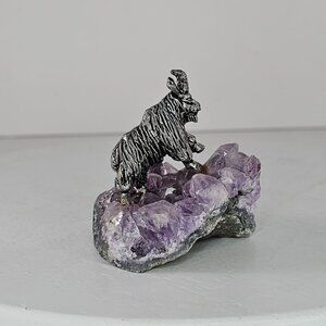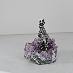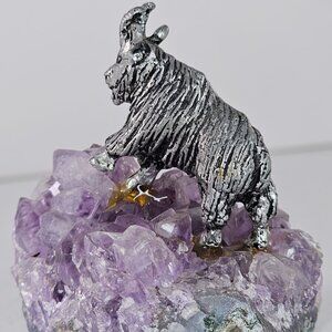 A distinctive pewter mountain goat figurine perched on a natural amethyst crystal base adds a unique touch to any space. The detailed craftsmanship enhances its charm.