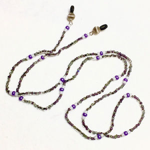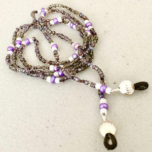 Composed of pewter gray, purple, and white seed beads with elastic/metal connectors.