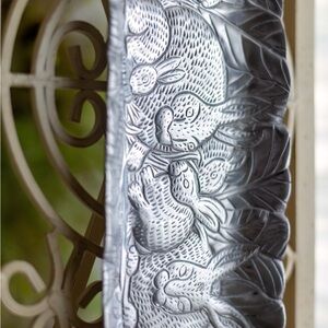 The embossed detailing includes classic spring motifs such as lettuce leaves, florals, and sweet bunny accents — making this a stunning addition to a spring or Easter table.
