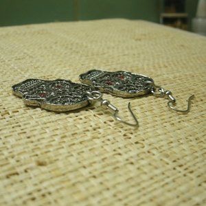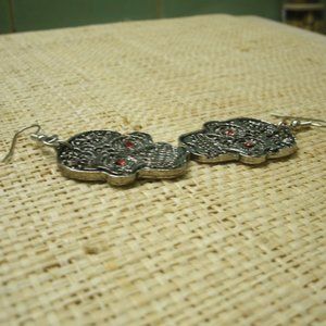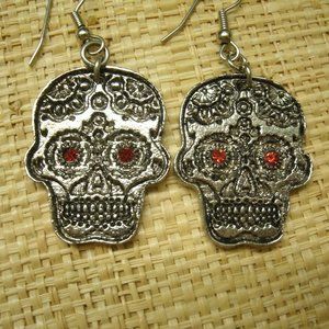 This is a pair of sugar skull earrings made of silver pewter. Eyes are red sets. Hook ear wires. Brand new. 2 inches high including hook, 1 inch wide. Great for anyone who loves skulls.
