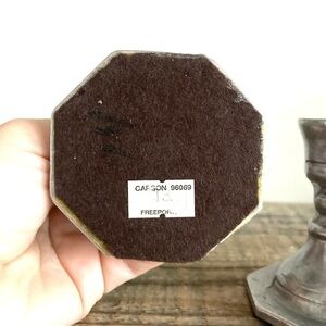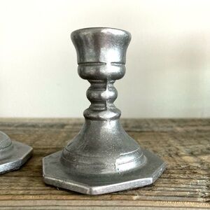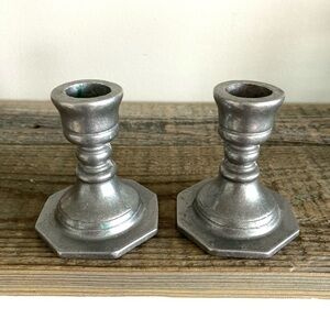 Pewter candlesticks. Silver tone. Great for those of us who don’t prefer gold! Pewter is a soft metal so there are areas of scratching on these. Some candle wax debris. There’s a seam on the sides which indicates that these were created using a mold. Perfect on a mantel or shelves.