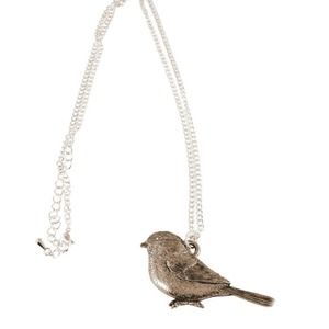 Pewter chickadee necklace. Poecile atricapillus, 1.9 inches (4.8 cm) long X 1.1 inches (2.7 cm) tall. This sculpted Pewter Chickadee is expertly crafted into songbird art, sure to please the black capped backyard bird enthusiast. It's hung on an 18 inch (45 cm) silvertone chain with 2 inches (5 cm) extender chain, adjustable to 20 inches (51 cm). Closes lobster claw clasp. Handmade necklace.