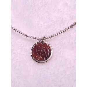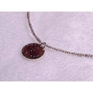 Circular pendant the center of which is in a pink-brown shade that has a translucent effect (liked stained glass) when held up to the light. The pendant has a floral design embossed onto it and has a silver edging. The pendant hangs from a necklace made of clear seed beads. Lobster clasp fastening. Necklace measures 17". No extension chain.