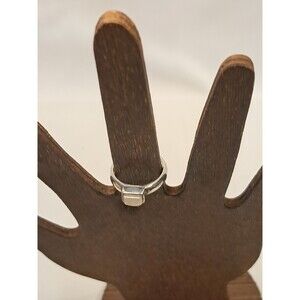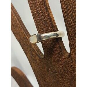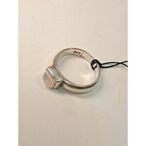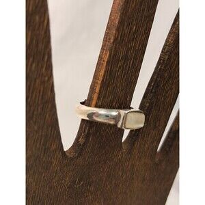 Sterling silver ring that features a central raised platform within which is, I believe, a larger moonstone* gemstone (creamy white in color with iridescent tones when light shines on its surface). The stone has a rectangular pyramid type shape (I am sure there is a correct term for this but I don't know it!) so the shorter sides taper away from the setting. Ring size 6 (see photo with sizing gauge). The ring is stamped 925 inside.