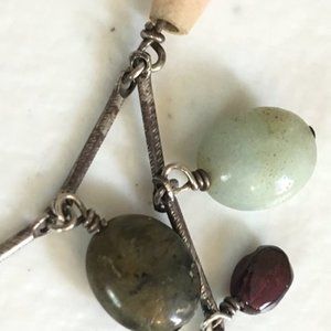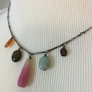 Peyote Bird Santa Fe bar chain necklace. Stamped 925 sterling silver. Features five semi-precious stone drop pendants. Oxidization/discoloration on the chain but wasn't cleaned prior to photos. Light wear throughout. The orange stone has a chip or natural indentation but doesn't take away from this stunning necklace.