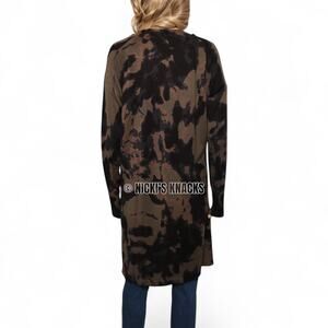 Layer up in bold style with this Peyton Jensen camo duster cardigan from Evereve. Made from soft, lightweight rayon knit, it features a classic green, black, and brown camouflage pattern with a longline silhouette, open front, and side slits for movement. Perfect for transitional layering, it brings a touch of edge to everyday looks.