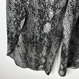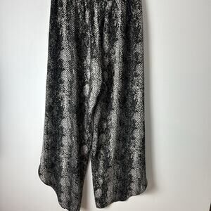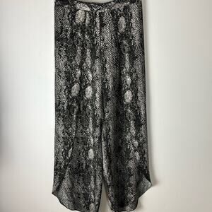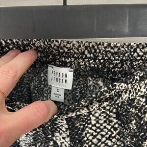 Gently Used Peyton Jensen Pants. These are a women's small. Black and off white snakeskin pattern throughout. Super flowy with a split leg! 100% polyester. Made in USA.