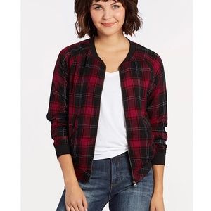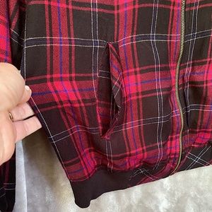 Peyton Jensen Plaid Bomber Jacket, Size M, Red/Black/Royal Blue. Comfortable lightweight lined plaid bomber jacket perfect for cool fall days, easy layering piece, front zip closer, side slit pockets, ribbed mandarin collar, cuffs & waistband. Good Condition, Smoke Free & Pet Free Home.