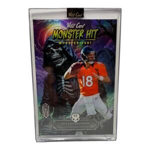 This unique Peyton Manning football card from the 2025 Wild Card Monster Hit Monster Hunt series is a 1/1 exclusive collectible. Featuring the iconic quarterback in his Denver Broncos uniform (#18), the card showcases a striking design with a menacing skeleton figure in the background, emphasizing the Monster Hit theme. The front includes the True 1/1 emblem, confirming its one-of-a-kind rarity.