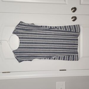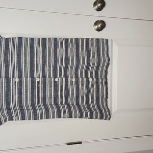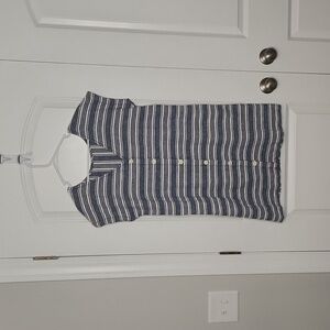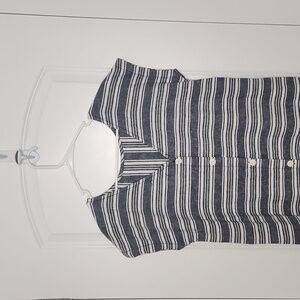 Lovely striped linen blend shift dress. Button down front closure. Short cap sleeves. V-neckline. Side pockets. Extra button included.