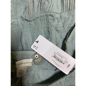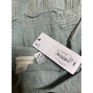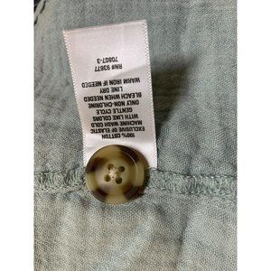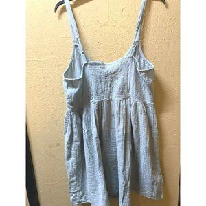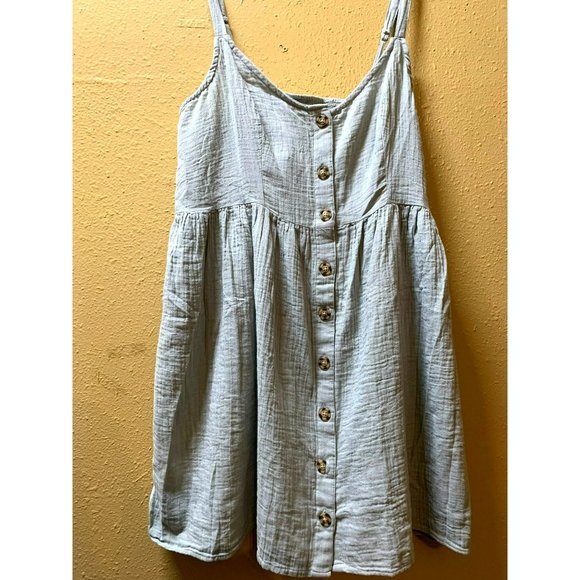 Loose fit, button opening in front 38 inches from top shoulder strap to bottom hem 20 inches wide at waist then building up to 38 inches across at flare of dress