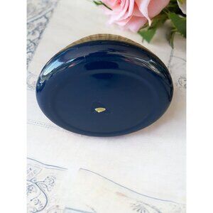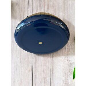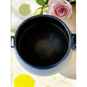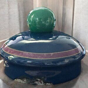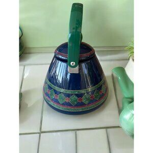 This vintage enamel tea kettle features a striking blue and green design with geometric patterns. Its sturdy handle and spout make it a functional and stylish addition to any kitchen.