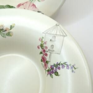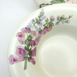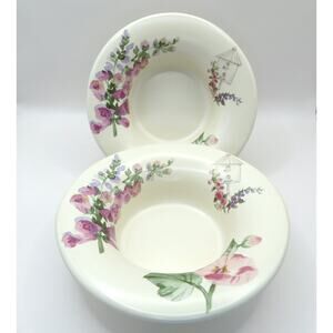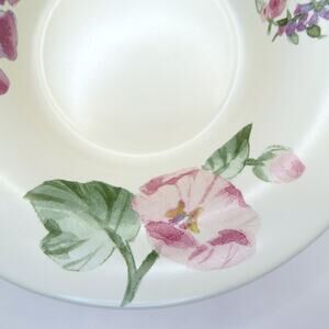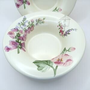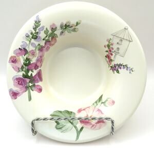 These beautiful stoneware pillar candleholders are in the Cape May birdhouse floral pattern by Pfaltzgraff. These are very rare pieces in the Cape May collection and have beautiful pink and purple florals with a birdhouse.