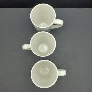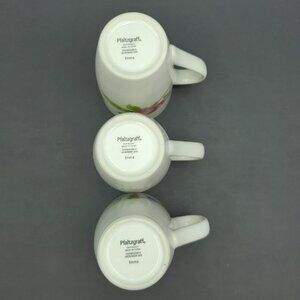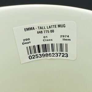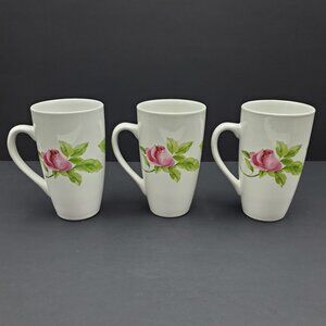 Pfaltzgraff "Emma" Tall Latte Mugs - Set of 3. NWT (all 3 had UPC stickers, 2 didn't make it through the wash) 16 ounce, 6-1/8" tall, 3-5/8" wide. Heavy, white mugs featuring a pink rose on one side and a purple flower on the other. Gorgeous mugs even if you don't collect the vintage, retired Emma pattern.