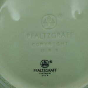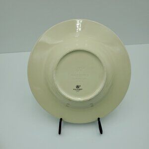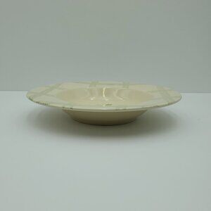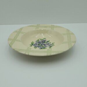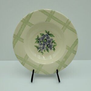 Pfaltzgraff Garden Party Rim Soup Bowls Individual Pasta Bowls - Set of 2. Very good pre-owned condition with a few nicks on the bottom rims. 9" x 1.5". Cream colored rimmed bowls with green latice on the rim and purple flowers in the center.