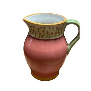 This Pfaltzgraff Pistoulet Pitcher by Jana Koipen in Deep Orange/Gold/Green/Yellow features a delightful solid color with tiny flower accents. Measuring 7.25x6.5 inches, it adds charm to any occasion.