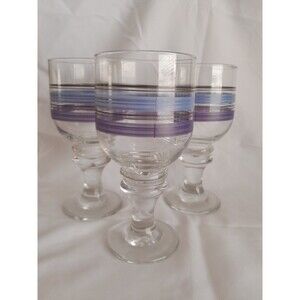 Vintage set of three vintage glasses from Pfaltzgraff's Rio collection. Blue and purple striped pattern, these goblets and rocks glasses are perfect for serving iced tea or water. Both durable and stylish.