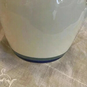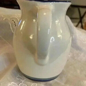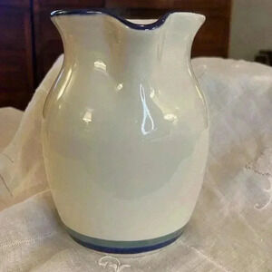 Off white 6.5” pitcher. Blue rim with blue green striped band at bottom. In very nice condition. See pictures for all angles.
