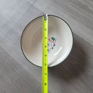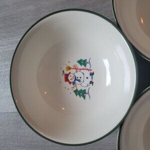 This set of Pfaltzgraff bowls features a charming snowman design, ideal for adding a touch of festive cheer to your dining table during the holiday season. Crafted from durable porcelain, these bowls are perfect for serving side dishes, cereal, or soup, offering both functionality and holiday spirit.