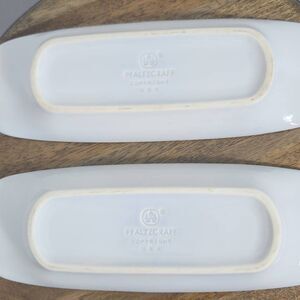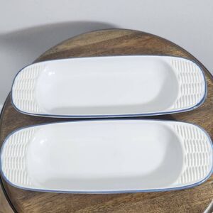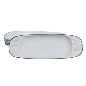 Pfaltzgraff set features four oblong basketweave plates for corn cobs, crackers, or appetizers. Beautiful basketweave pattern. Has some yellow areas that could possibly be cleaned. Measurements are shown in the images.