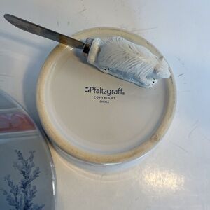 Winter Frost Ceramic Cheese Tray shaped as a decorative ornament with a Stainless Steel Knife with a sculpted Polar Bear Handle. Includes a Ceramic Bowl with evergreen design and frosted blue interior. Has a Stainless Steel Spreader with a sculpted Polar Bear Handle. Excellent condition.