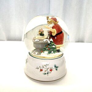 This charming musical snow globe from Pfaltzgraff's Winterberry Collection brings the spirit of Christmas to life with its intricate Santa Claus design. The globe depicts Santa beside a detailed snowy scene, and when wound, it plays the heartwarming tune "I'll Be Home For Christmas." A timeless holiday decoration for collectors and enthusiasts.