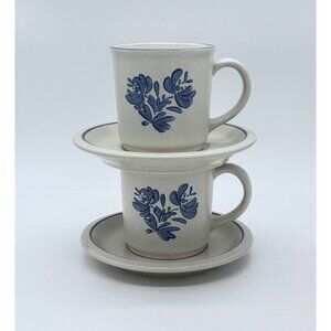 This vintage Pfaltzgraff Yorktown coffee mug and saucer set exudes timeless charm. Crafted from durable stoneware, it features a classic blue floral design against a neutral background, embodying the rustic elegance of the Yorktown collection. Ideal for collectors or those who appreciate heritage kitchenware.