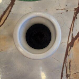 Preowned, no chip or crack. The graphic is clear. There is stamp at the bottom as well. Interior is also clean. Have been used as decor, not put any liquid inside.