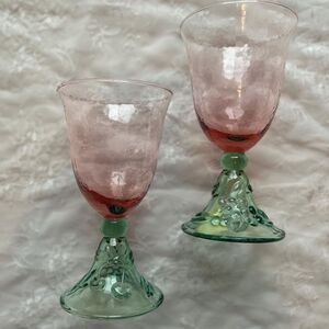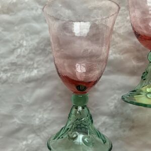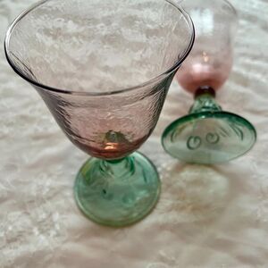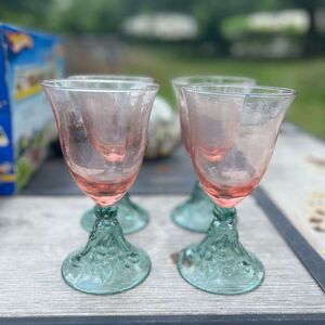 This set of 4 Pfaltzgraff glasses is a great addition to any kitchen. The green and watermelon pink colors provide a pop of color to your drinkware collection. These glasses are perfect for all occasions, whether you are hosting a dinner party or just enjoying a quiet night in. The glasses are hand-blown and have a mid-century modern style to them.