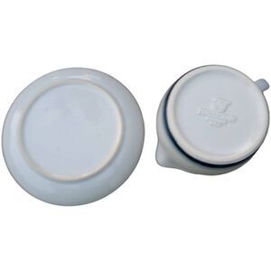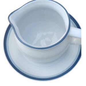 Pre-owned pfaltzgraff stoneware gravy boat and plate. Pattern is sky. Measures 4 in tall by 3.5 in around on a 6-in plate