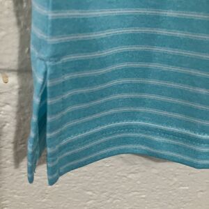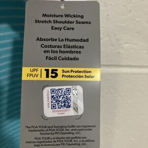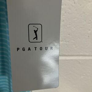 The product is a men's PGA Tour Golf Polo Shirt in size M, featuring a collared neckline, pullover closure, and short sleeves. The shirt is made from a blended fabric of polyester and elastane, making it easy to care for and breathable. It comes in a stylish blue Curacao color, perfect for summer, fall, or spring. The shirt is designed for active wear or casual occasions, ideal for walking or golfing. With its classic sports theme and logo accents, this polo is a great addition to any man's wardrobe.