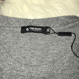 New without tags! Phan Nguyen Men’s Wear Long Sleeve T-Shirt. Heather Gray. Basic Tee with a logo tag on the side. This shirt does have two small factory holes around the tag, as shown in the picture. 90% cotton, 10% spandex.