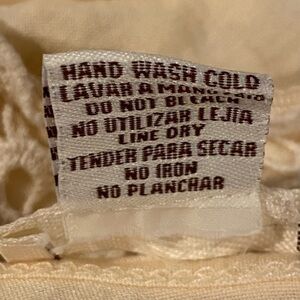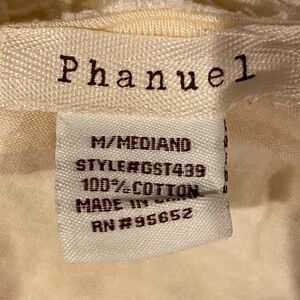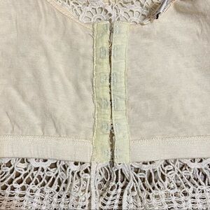 This adorable crop top from Phanuel is in excellent preowned condition. It’s marked as a size medium. The top is a cream colors crop with an open knit attached over the top with a small peplum flare. The back closes with hooks and eyes for a secure fit.