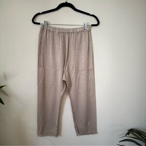 Meet Erika - The classic Pharaoh pant with a slight drop rise fit. An elasticized waistband is added for a pull-on comfort. Features a raw-edge hem and front pockets.