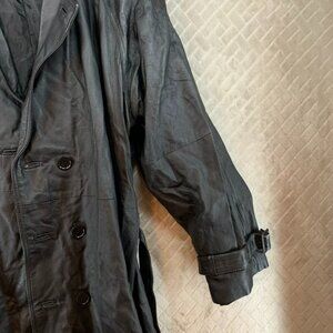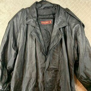 Phase 2 Mens M Long Trench Coat Black Leather Double Breasted Button Up Belted. There is small amounts of wear in the leather near the buckles, cuffs of the sleeve, and the back near the heels. There are no holes.