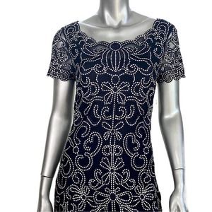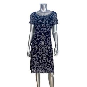 Phase Eight Navy Blue Embroidered Mesh Netting Overlay Scalloped Trim Sheath Dre