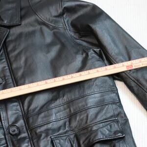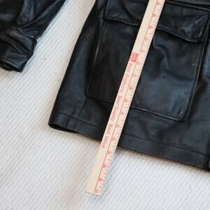 Classic Phase Two genuine leather jacket in black. Features a zip and button front closure, two large flap pockets, and a structured collar. Fully lined for comfort and warmth. Men’s size Large. Approximate measurements: 24” pit to pit, 32” length. Shell is leather; lining and fill are polyester. A versatile and timeless piece that works well for casual or dressy styling. Good pre-owned condition with some signs of wear and rubbing.